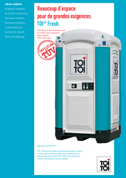 La première cabine sanitaire attestée selon la norme TÜV allemande. TOI® Fresh est une toilette mobile offrant un meilleur confort, une meilleure fonctionnalité et un plus beau design. La cabine TOI® Fresh est certainement le bon choix pour les visites de toilette avec de plus hautes exigences.